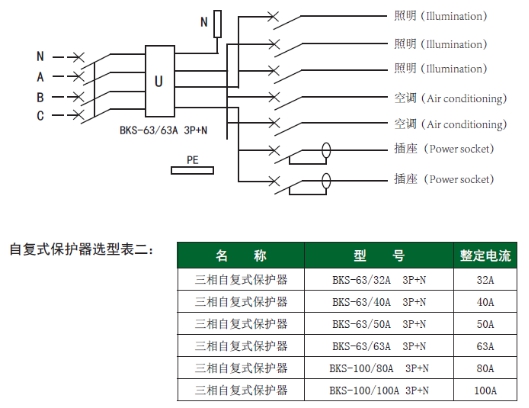 B、三相自复式过欠压保护器应用示例和主要技术参数